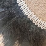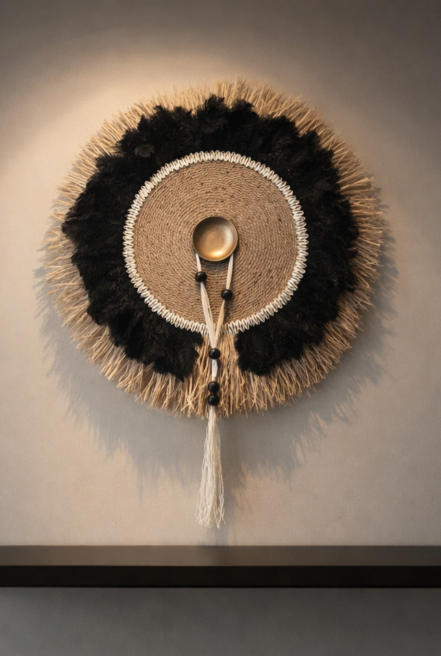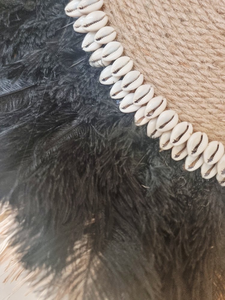 Composition murale artisanale réalisée en corde de chanvre, raphia, cauris, perles en bois et plumes d’autruche.