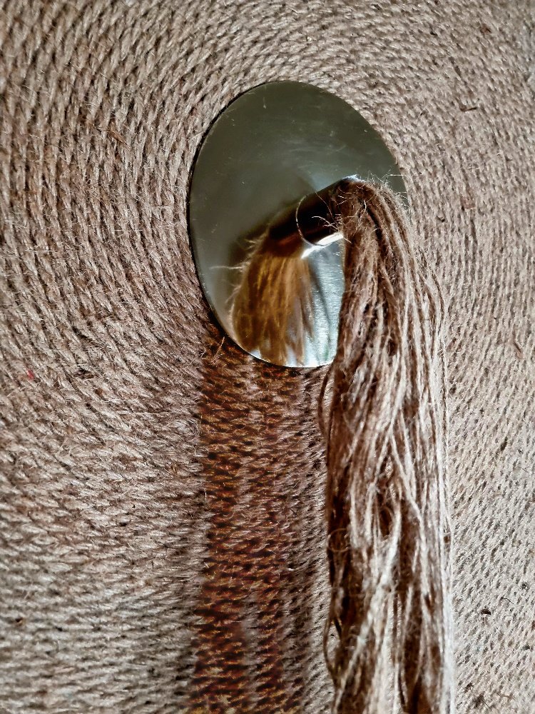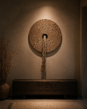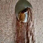 Disque tissé en fibres naturelles, Sillage évoque un point d’ancrage, un centre silencieux d’où tout rayonne. Sa texture dense et organique capte la lumière, tandis que la chute de fibres libérées crée un mouvement vivant, presque rituel.
