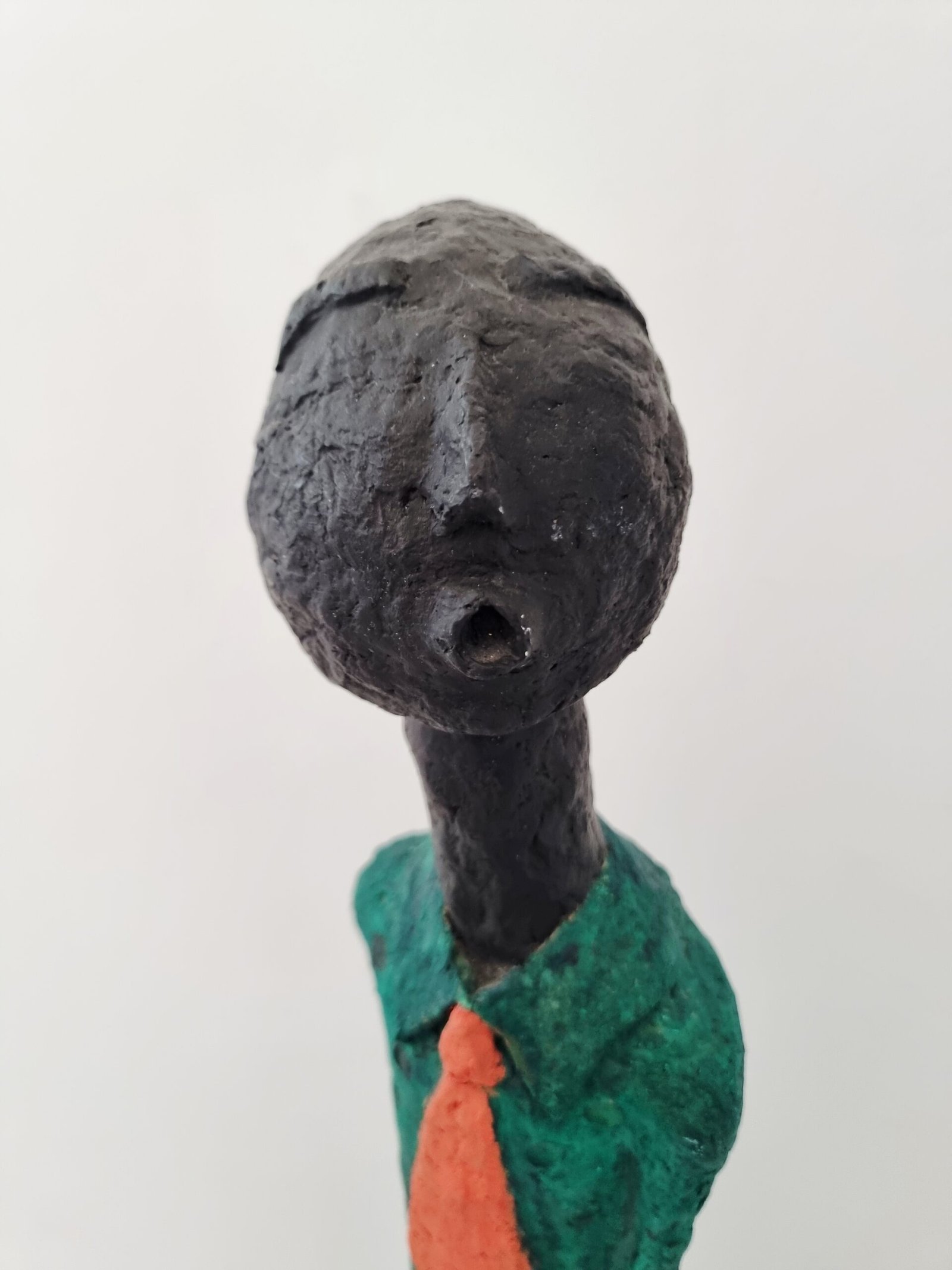 Sculpture artisanale en papier mâché,”Le Dandy Silencieux”incarne une élégance singulière et poétique. Sa silhouette allongée, vêtue d’un costume vert texturé à pois et d’une cravate orange éclatante, évoque un personnage discret mais affirmé, figé dans une posture contemplative.