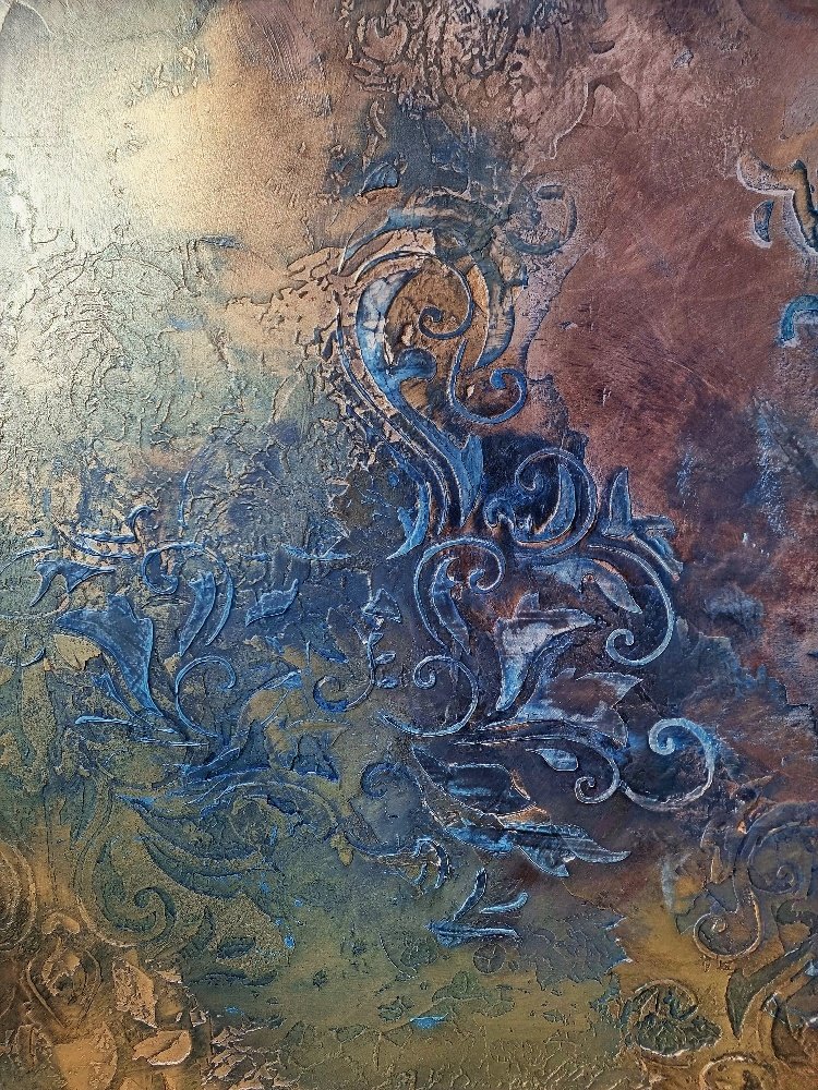 Création unique réalisée sur plaque de BA 13, cette oeuvre marie textures stucco et pigments lumineux. les reliefs en arabesques s’entrelacent dans une danse subtile de bleus profonds d’or et de terres chaudes, évoquant un ciel tourmenté ou un rêve en mouvement. L’effet stucco apporte richesse de matière et une profondeur tactile qui capte la lumière selon l’angle.