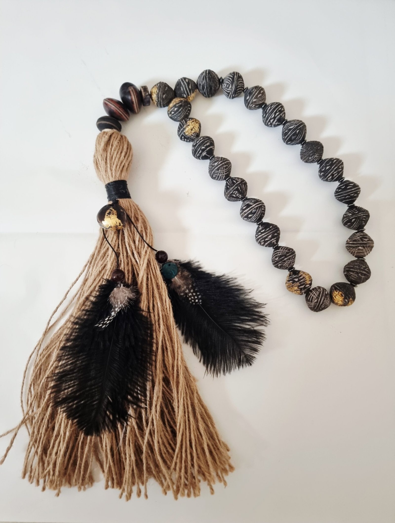 est une suspension murale artisanale pensée comme un objet protecteur et décoratif. Composée de perles en terre cuite noire gravées aux reflets dorés, de coques végétales et coquillage. Un pompon en fibre naturelle orné de plumes sombre Entre force et finesse, entre matière brute et détails subtils.