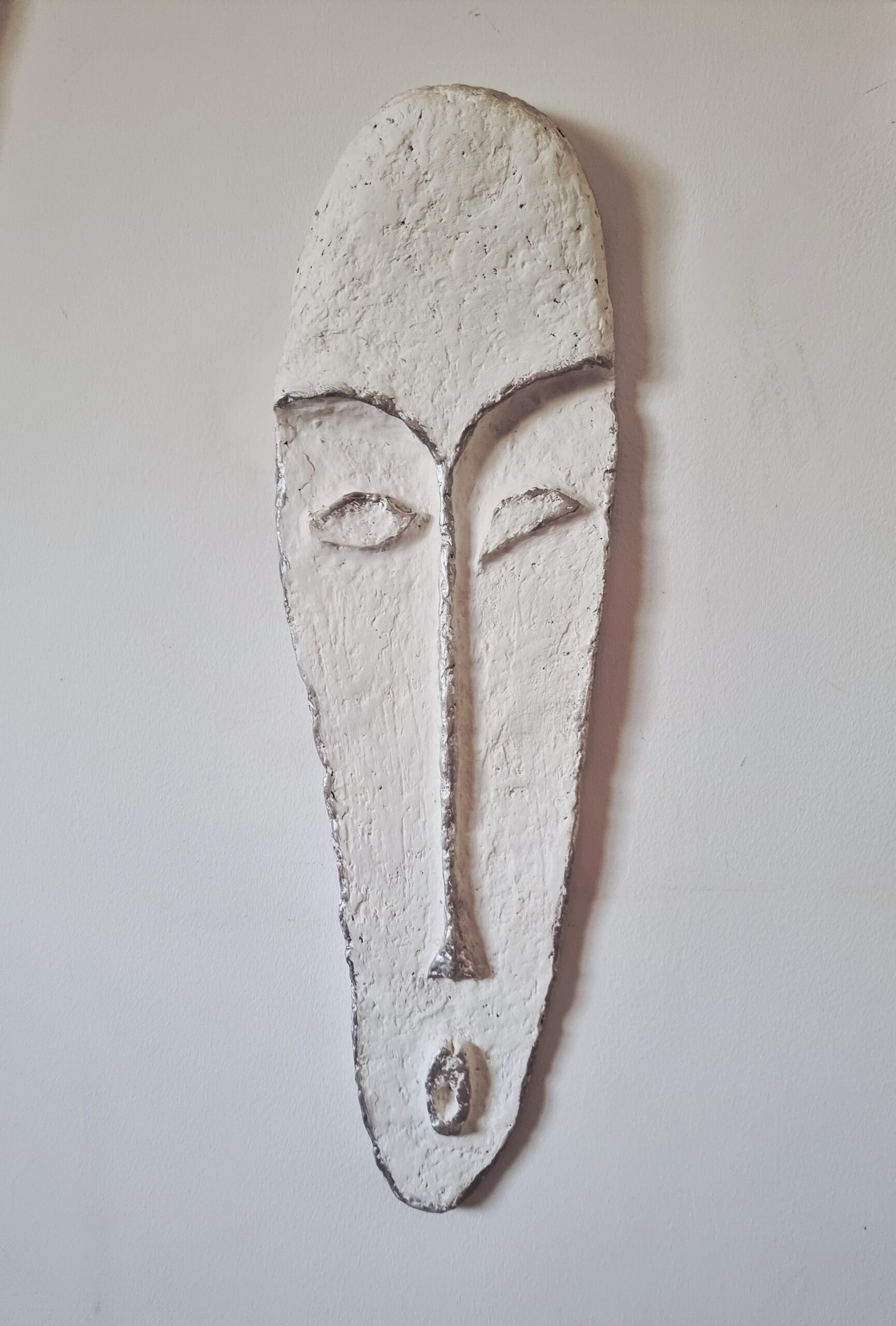 Ce masque mural en papier mâché, baptisé ”esprit blanc”, incarne la pureté, la sérénité et l’essence du sacré. Modelé à la main dans une forme élancée et primitive, il évoque une figure de veille silencieuse, un esprit protecteur à la présence apaisante. Sa texture brute, légèrement irrégulière, renforce son caractère artisanal et spirituel. Le blanc mat rehaussé de légers reliefs argentés, symbolise l’éveil, la paix intérieure et la lumière.