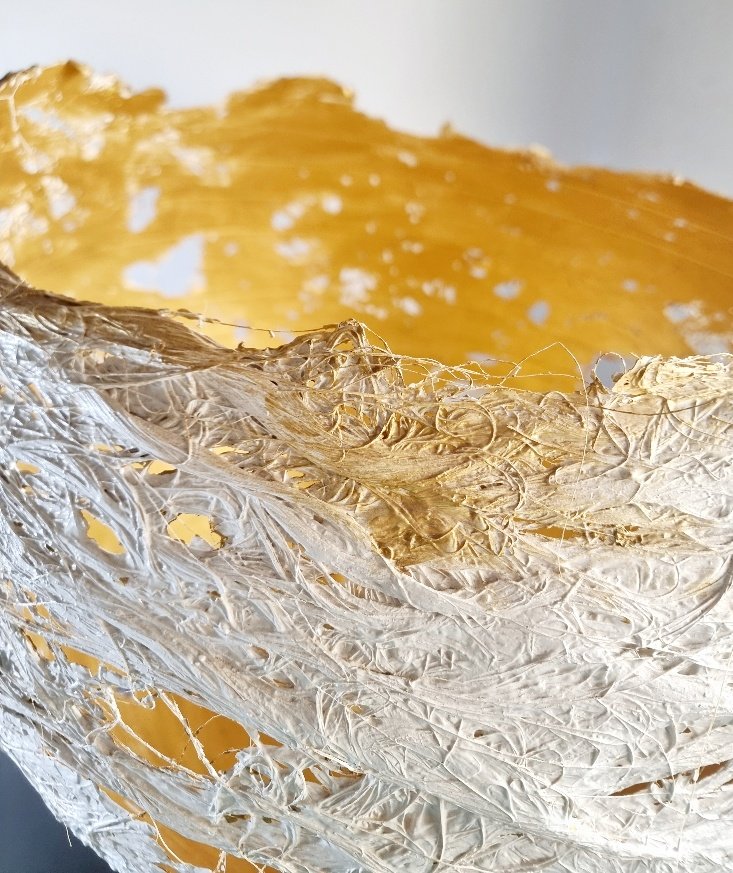 Sculptée à la main à partir de ciment blanc et fibres naturelles, cette d’ambiance évoque un cocon minéral ajouré, à la fois brut et délicat. sa structure texturée, irrégulière et organique, diffuse une lumière chaleureuse par de fines ouvertures créées par l’enchevêtrement des fibres, formant un jeu d’ombres doux et vivant sur les murs.