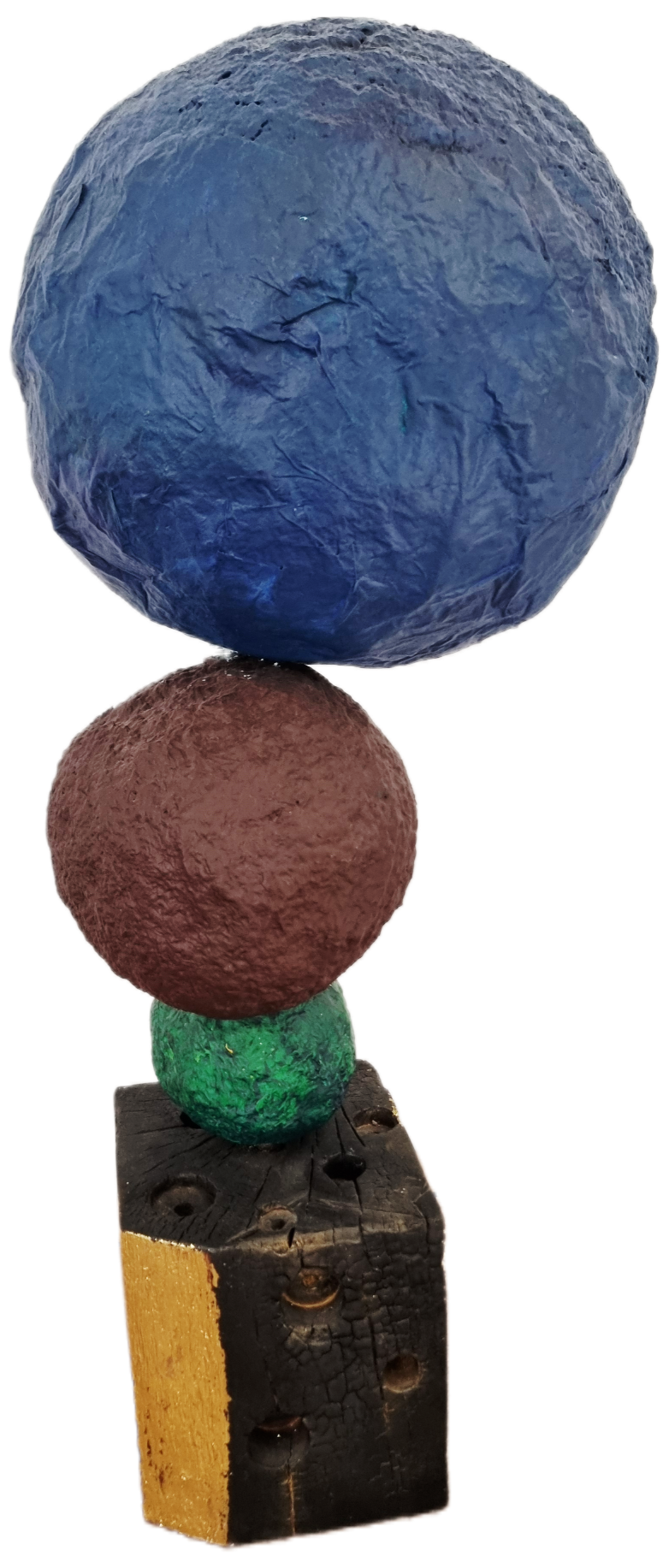 Avec ses formes empilées et ses couleurs, ”Nomo Totem”est une sculpture qui capte l’attention. Chaque éléments – sphères colorées et cube en bois texturé – est façonné à la main en papier mâché, créant un jeu d’équilibre à la fois graphique et poétique. Le cube base, troué et brulé au chalumeau évoque la matière ancienne, contrastant avec la rondeur et la vivacité des boules vert, chocolat, bleu cobalt.
