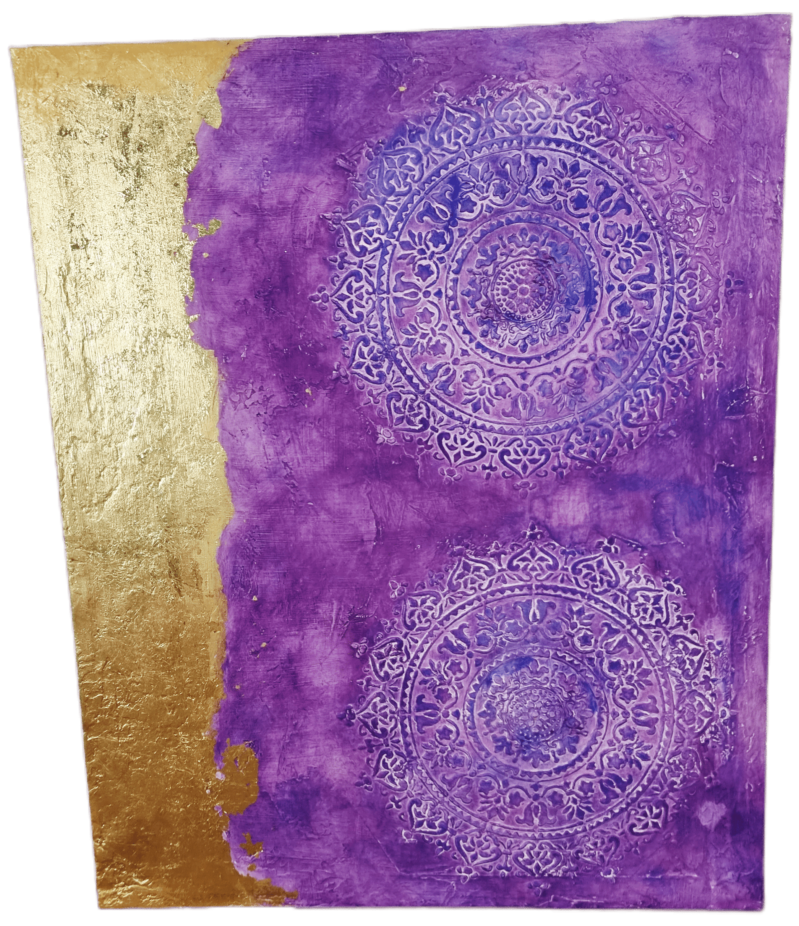 Matériaux: support plaque de plâtre BA13, enduit texturé et pochoir en relief, peinture acrylique violet et indigo, application à la feuille d’or pour une touche luxueuse.